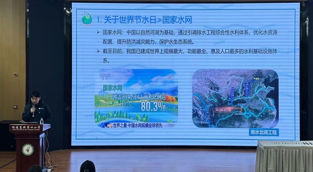 随后,支部在报告厅为四年级学生带来一场生动有趣的“世界水日”主题宣讲。主讲人钱宝灏、赵若彤结合专业知识,以图文并茂的方式,向同学们介绍了世界水日的由来、历年主题、国家水网建设成就,以及农业节水灌溉的多种方式,如喷灌、滴灌、微灌、地下灌溉和新型陶瓷灌水器技术。宣讲还特别结合杨凌与西安的用水历史脉络,深入浅出讲解了引汉济渭工程如何实现长江与黄河在关中大地“握手”,让同学们感受到国家水网建设的宏伟与深远影响。