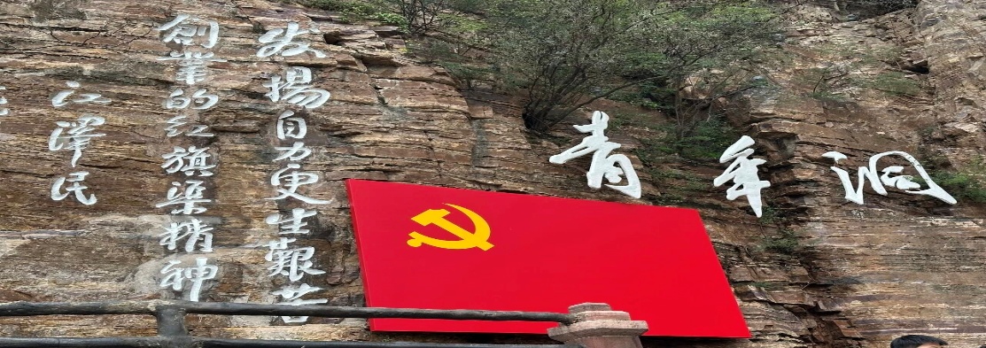 随后,支部成员徒步前往红旗渠总干渠咽喉工程——青年洞。穿行于紧贴绝壁的渠廊之上,俯瞰奔流的渠水,仰望巍峨的太行山崖,大家真切感受到当年300多名青年突击队队员历时17个月打通616米隧洞的非凡壮举。在每人每天仅六两粮食、靠挖野菜充饥的极端条件下,青年们创造了“连环炮、三角炮”等爆破技术,用青春和汗水铸就了这座精神丰碑。站在青年洞前,大家仿佛亲眼见证先辈们腰系绳索、凌空凿石的无畏身影,深刻领悟了“自力更生、艰苦创业、团结协作、无私奉献”的红旗渠精神。