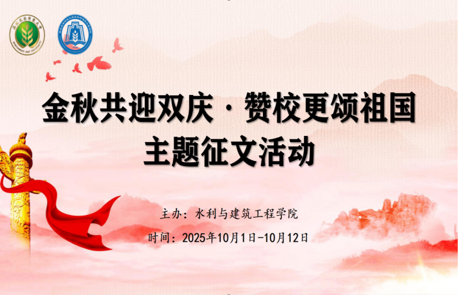 金秋颂盛世,笔墨写华章。为庆祝中华人民共和国成立76周年,进一步激发广大学子的爱国热情与爱校情怀,水建学院于国庆期间面向全校本科生,成功举办“金秋共迎双庆,赞校更颂祖国”主题征文活动。