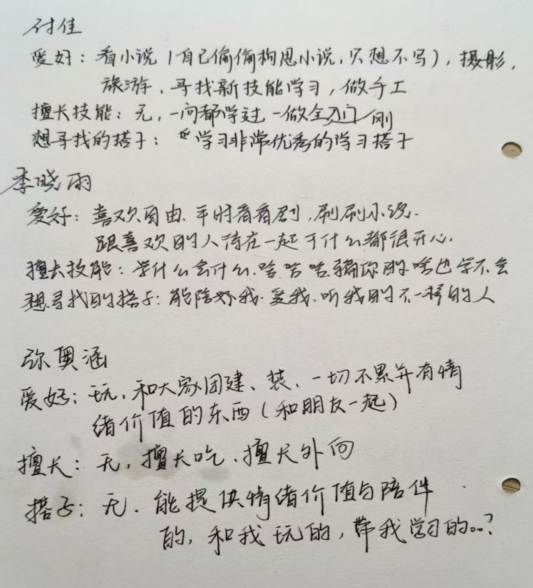 本次活动旨在充分展现学生个性与团队协作精神。活动中,各宿舍共同设计特色兴趣卡片,填写“我们热爱”与“我想寻找”等内容。涵盖乐器、绘画、编程、摄影等多个领域。卡片形式多样,既有手绘插画,也有电子设计,创意纷呈。