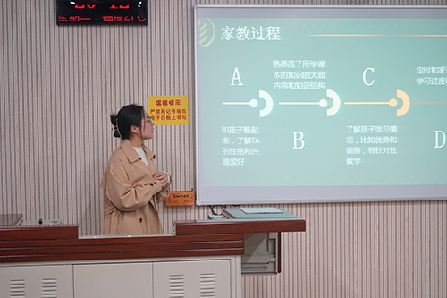 首先是社践部负责人李金钋为大家详细地介绍了阳光家教的活动详细情况。其次,在大会上第九届阳光家教杰出志愿者王慧、杨瑀露、赵小宇、张皓天等和同学们交流自己在活动过程中的经验,分享在家教过程中的收获以及遇到的一些挫折。在提问环节中,几位优秀的志愿者详细解答了同学们在活动中存在的疑问。