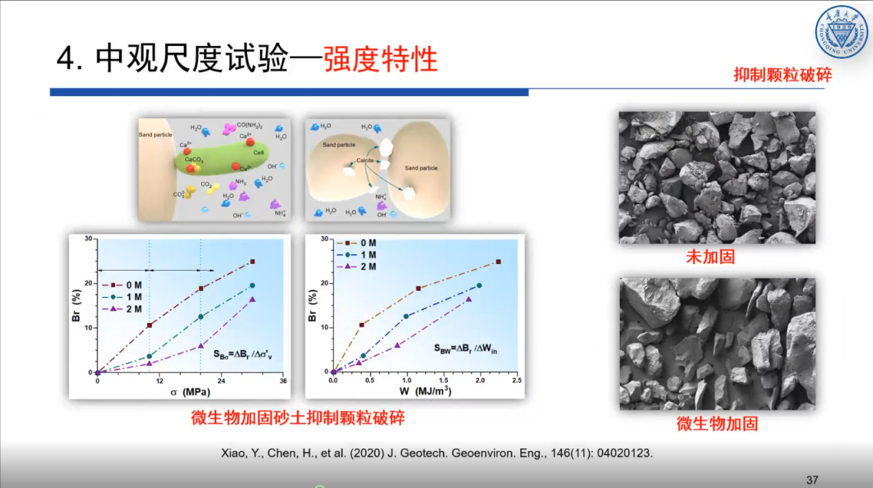 报告会上,肖杨教授以“海洋强国”、“一带一路”以及“双碳目标”战略为背景,从微生物诱导碳酸钙沉积技术固化土体的概念、微细观尺度试验、机理与理论,中观尺度试验、机理与理论以及宏观尺度试验四个角度出发对其课题组的研究进展及成果进行了详细的汇报,并探讨了微生物固化技术在砂土地震液化、边坡加固、防风固沙、古建筑修复等方面的应用。最后,肖杨教授对报告内容做了总结与展望并提出了一些有待研究的重要科学问题。